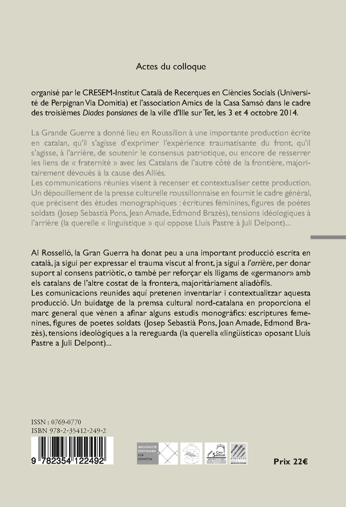 Nées de la formalisation des relations entre les Etudes Catalanes de l’Université de Perpignan et la ville d’Ille (Convention Université-ICRESS/Ville d’Ille sur Tet, 2011) pour la valorisation scientifique et économique du patrimoine littéraire et linguistique roussillonnais, les Diades ponsianes (Journées ponsiennes, de Joseph Sébastien Pons écrivain illois majeur, 1886-1962) prennent la forme d’un colloque annuel de chercheurs en langue et lettres catalanes. La guerre a donné lieu en Roussillon à une importante production écrite en catalan, qu’il s’agisse de traduire en poésie l’expérience traumatisante des combats, ou qu’il s’agisse pour ceux de l’arrière, de soutenir le consensus patriotique. Sous le titre de  » La guerre des écrivains roussillonnais « , les communications réunies visent à recenser et contextualiser ces écrits. Sont étudiés plus particulièrement trois poètes combattants: Josep Sebastià Pons, Jean Amade, Edmond Brazès.