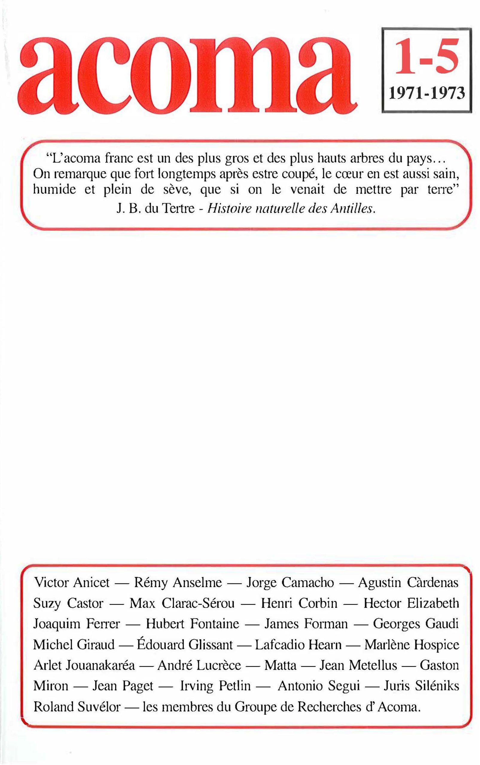 Revue de littérature, d’art et de sciences humaines fondée par Edouard Glissant, « Acoma » a accompagné, au début des années 1970, le renouveau de la réflexion dans les pays antillais et caribéens. L’action culturelle y est pensée comme le renforcement incontournable de toute perspective politique et sociale. Le présent volume offre le fac-similé des numéros 1 à 5 publiés de 1971 à 1973.