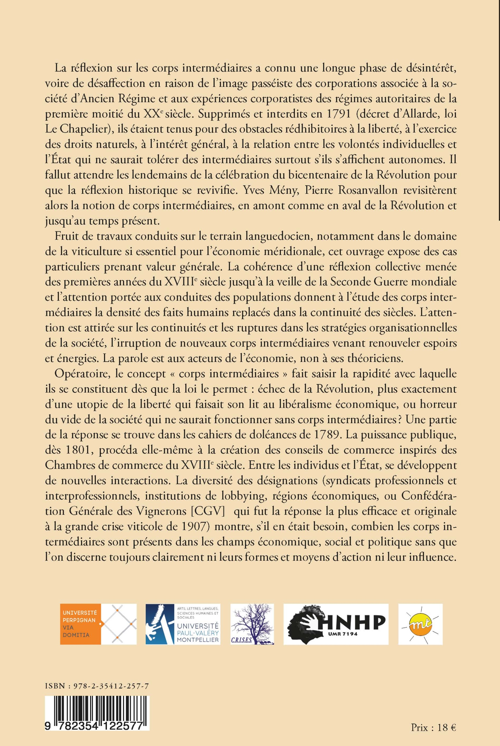 La réflexion sur les corps intermédiaires a connu une longue phase de désintérêt, voire de désaffection en raison de l’image passéiste des corporations associée à la société d’Ancien Régime et aux expériences corporatistes des régimes autoritaires de la première moitié du XXe siècle. Supprimés et interdits en 1791 (décret d’Allarde, loi Le Chapelier), ils étaient tenus pour des obstacles rédhibitoires à la liberté, à l’exercice des droits naturels, à l’intérêt général, à la relation entre les volontés individuelles et l’État qui ne saurait tolérer des intermédiaires surtout s’ils s’affichent autonomes. Il fallut attendre les lendemains de la célébration du bicentenaire de la Révolution pour que la réflexion historique se revivifie. Yves Mény, Pierre Rosanvallon revisitèrent alors la notion de corps intermédiaires, en amont comme en aval de la Révolution et jusqu’au temps présent.