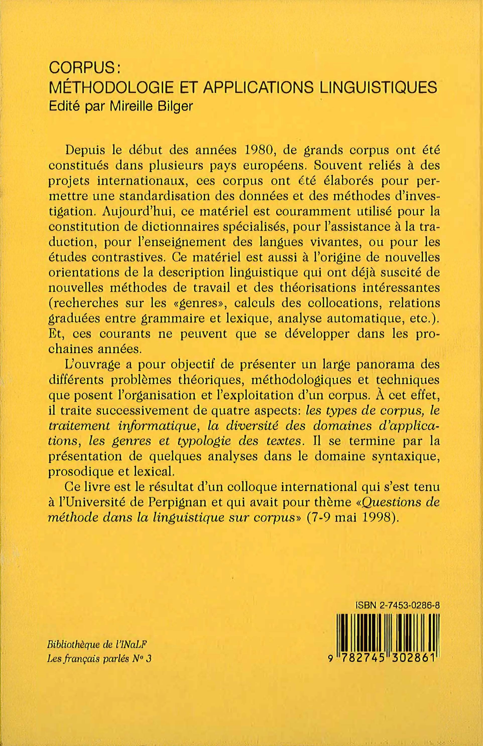 Ce livre est le résultat d’un colloque international qui s’est tenu à l’Université de Perpignan et qui avait pour thème « Questions de méthode dans la linguistique sur corpus » (7–9 mai 1998).