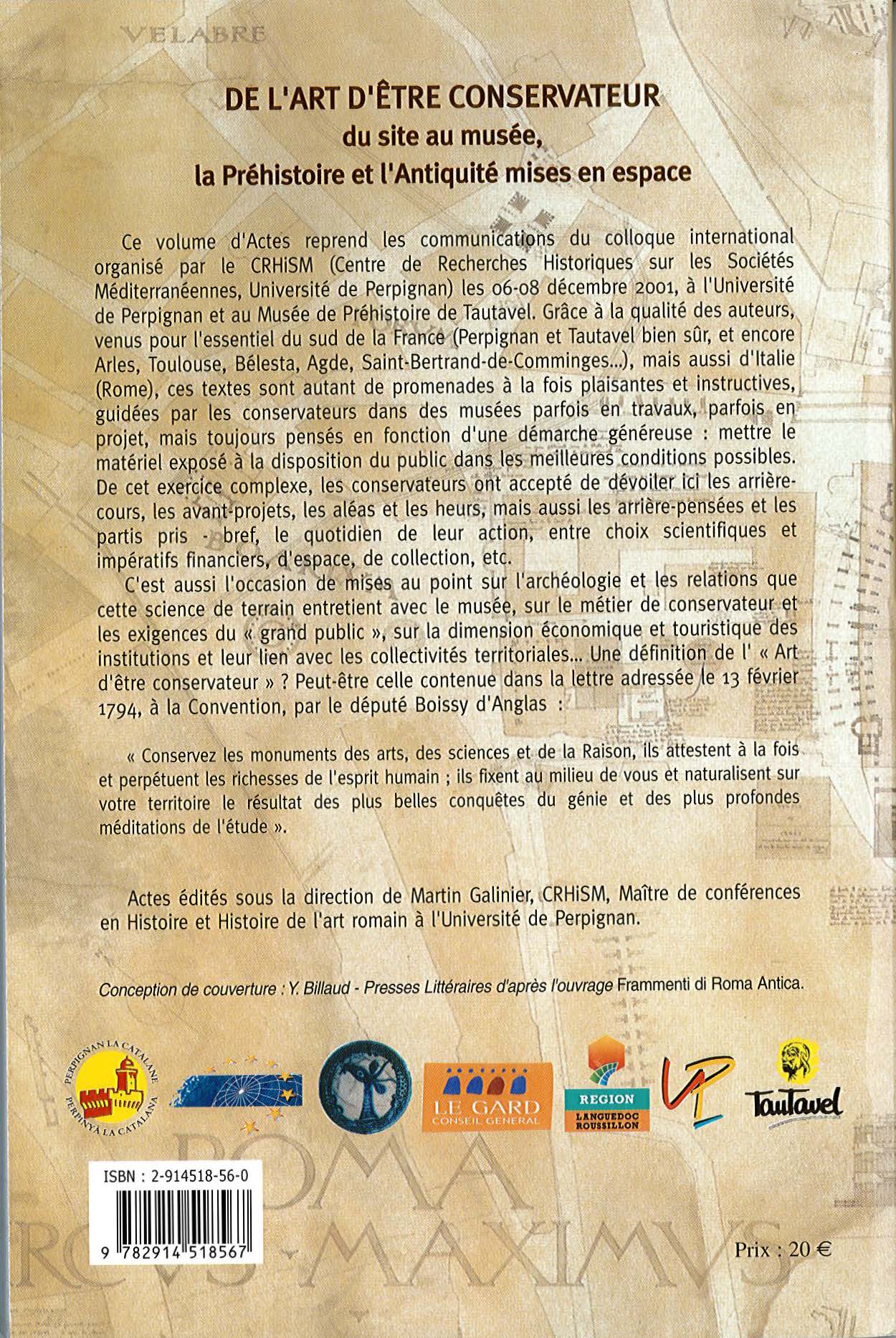 Ce volume d’Actes reprend les communications du colloque international organisé par le CRHiSM (Centre de Recherches Historiques sur les Sociétés Méditerranéennes, Université de Perpignan) les 06-08 décembre 2001, à l’Université de Perpignan et au Musée de Préhistoire de Tautavel. Grâce à la qualité des auteurs, venus pour l’essentiel du sud de la France (Perpignan et Tautavel bien sûr, et encore Arles, Toulouse, Bélesta, Agde, Saint-Bertrand-de-Comminges…), mais aussi d’Italie (Rome), ces textes sont autant de promenades à la fois plaisantes et instructives, guidées par les conservateurs dans des musées parfois en travaux, parfois en projet, mais toujours pensés en fonction d’une démarche généreuse : mettre le matériel exposé à la disposition du public dans les meilleures conditions possibles. De cet exercice complexe, les conservateurs ont accepté de dévoiler ici les arrière-cours, les avant-projets, les aléas et les heurs, mais aussi les arrière-pensées et les partis pris – bref, le quotidien de leur action, entre choix scientifiques et impératifs financiers, d’espace, de collection, etc.