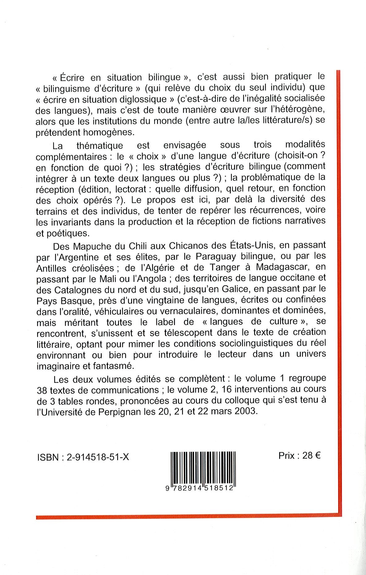 La thématique est envisagée sous trois modalités complémentaires : le « choix » d’une langue d’écriture (choisit-on ? en fonction de quoi ?) ; les stratégies d’écriture bilingue (comment intégrer à un texte deux langues ou plus ?) ; la problématique de la réception (édition, lectorat : quelle diffusion, quel retour, en fonction des choix opérés ?). Le propos est ici, par delà la diversité des terrains et des individus, de tenter de repérer les récurrences, voire les invariants dans la production et la réception de fictions narratives et poétiques.
