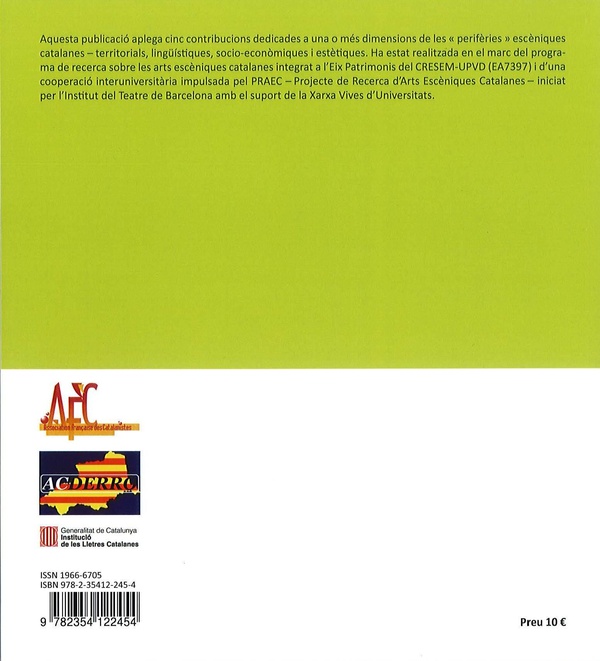 Aquesta publicació aplega cinc contribucions dedicades a una o més dimensions de les « perifèries » escèniques catalanes – territorials, lingüfstiques, socio-econàmiques i estètiques. Ha estat realitzada en el marc del progra­ma de recerca sobre les arts escèniques catalanes integrat a l’Eix Patrimonis del CRESEM-UPVD (EA7397) i d’una cooperació interuniversitària impulsada pel PRAEC – Projecte de Recerca d’Arts Escèniques Catalanes – iniciat per l’Institut del Teatre de Barcelona amb el suport de la Xarxa Vives d’Universitats.
