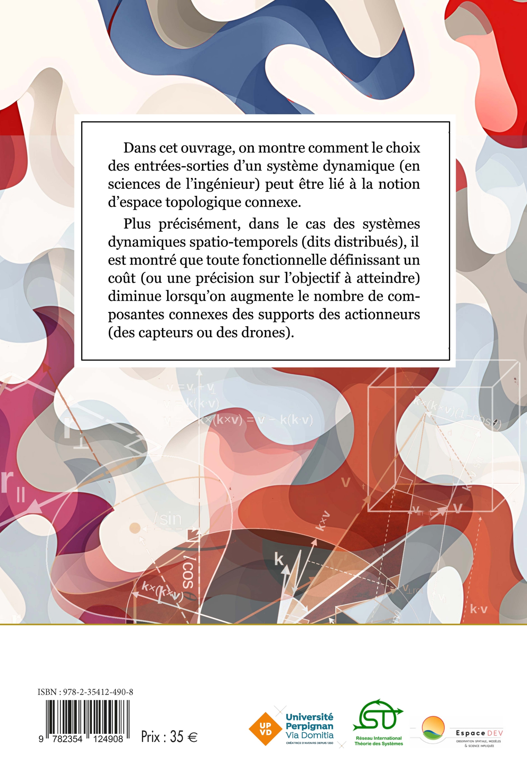 Dans cet ouvrage, on montre comment le choix des entrées-sorties d’un système dynamique ( en sciences de l’ingénieur) peut être lié à la notion d’ espace topologique connexe.Plus précisément, dans le cas des systèmes dynamiques spatio-temporels (dits distribués), il est montré que toute fonctionnelle définissant un coût ( ou une précision sur l’ objectif à atteindre) diminue lorsqu’on augmente le nombre de composantes connexes des supports des actionneurs (des capteurs ou des drones).