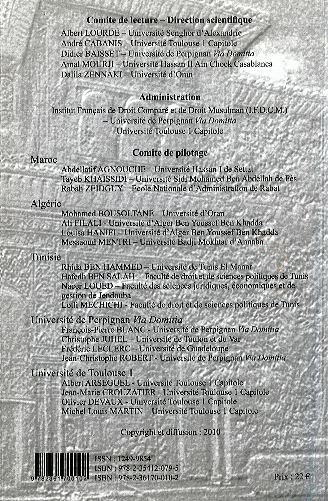 Ce dix-septième numéro de la Revue franco-maghrébine de droit comprend trois articles sur le Maroc, un sur la Tunisie et le cinquième marque un élargissement du champ des investigations puisqu’il porte sur le Machrek arabe.Les sujets traités dans les deux premiers articles touchent au droit de la famille, à travers le désaveu de paternité pour l’un et la protection de la femme pour l’autre. Deux autres articles concernent des sujets à la limite du droit économique et du droit pénal avec des investigations portant respectivement sur les formalités de dédouanement et sur la lutte contre le blanchiment de capitaux. Enfin l’auteur du cinquième article propose une réflexion sur :  » Quelle coopération culturelle entre le Machrek arabe et l’Europe ? « .