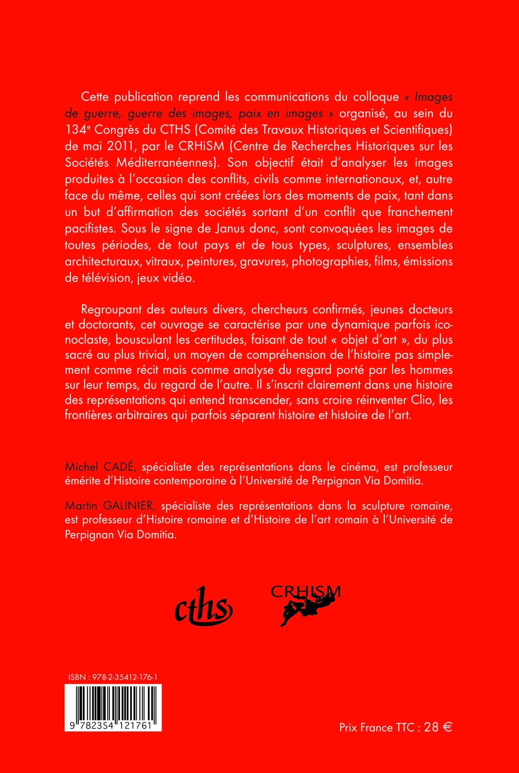 Cette publication reprend les communications du colloque « Images de guerre, guerre des images, paix en images » organisé, au sein du 134e Congrès du CTHS (Comité des Travaux Historiques et Scientifiques) de mai 2011, par le CRHiSM (Centre de Recherches Historiques sur les Sociétés Méditerranéennes). Son objectif était d’analyser les images produites à l’occasion des conflits, civils comme internationaux, et, autre face du même, celles qui sont créées lors des moments de paix, tant dans un but d’affirmation des sociétés sortant d’un conflit que franchement pacifistes. Sous le signe de Janus donc, sont convoquées les images de toutes périodes, de tout pays et de tous types, sculptures, ensembles architecturaux, vitraux, peintures, gravures, photographies, films, émissions de télévision, jeux vidéo.