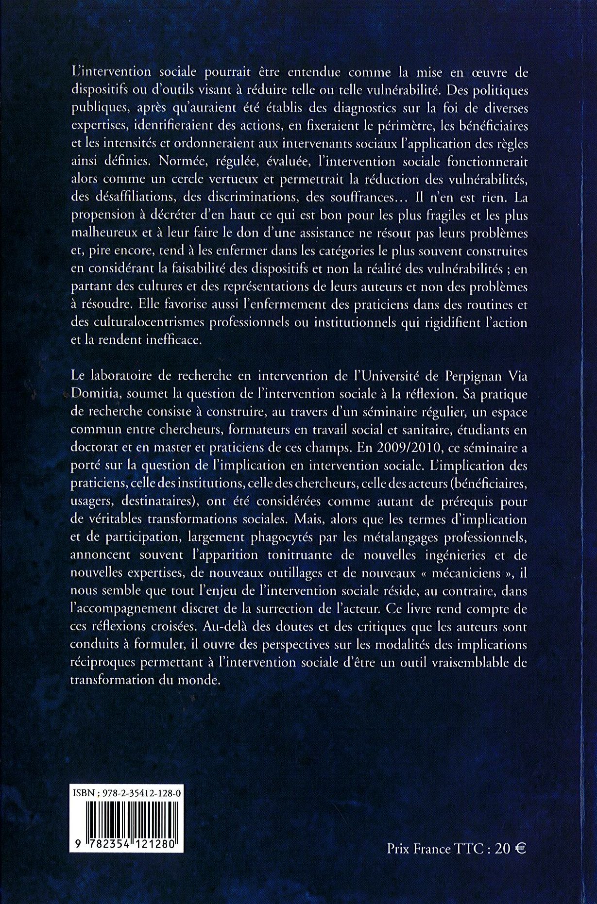 Le laboratoire de recherche en intervention de l’Université de Perpignan Via Domitia, soumet la question de l’intervention sociale à la réflexion. Sa pratique de recherche consiste à construire, au travers d’un séminaire régulier, un espace commun entre chercheurs, formateurs en travail social et sanitaire, étudiants en doctorat et en master et praticiens de ces champs. En 2009/2010, ce séminaire a porté sur la question de l’implication en intervention sociale. L’implication des praticiens, celle des institutions, celle des chercheurs, celle des acteurs (bénéficiaires, usagers, destinataires), ont été considérées comme autant de prérequis pour de véritables transformations sociales. Mais, alors que les termes d’implication et de participation, largement phagocytés par les métalangages professionnels, annoncent souvent l’apparition tonitruante de nouvelles ingénieries et de nouvelles expertises, de nouveaux outillages et de nouveaux « mécaniciens », il nous semble que tout l’enjeu de l’intervention sociale réside, au contraire, dans l’accompagnement discret de la surrection de l’acteur. Ce livre rend compte de ces réflexions croisées. Au-delà des doutes et des critiques que les auteurs sont conduits à formuler, il ouvre des perspectives sur les modalités des implications réciproques permettant à l’intervention sociale d’être un outil vraisemblable de transformation du monde.