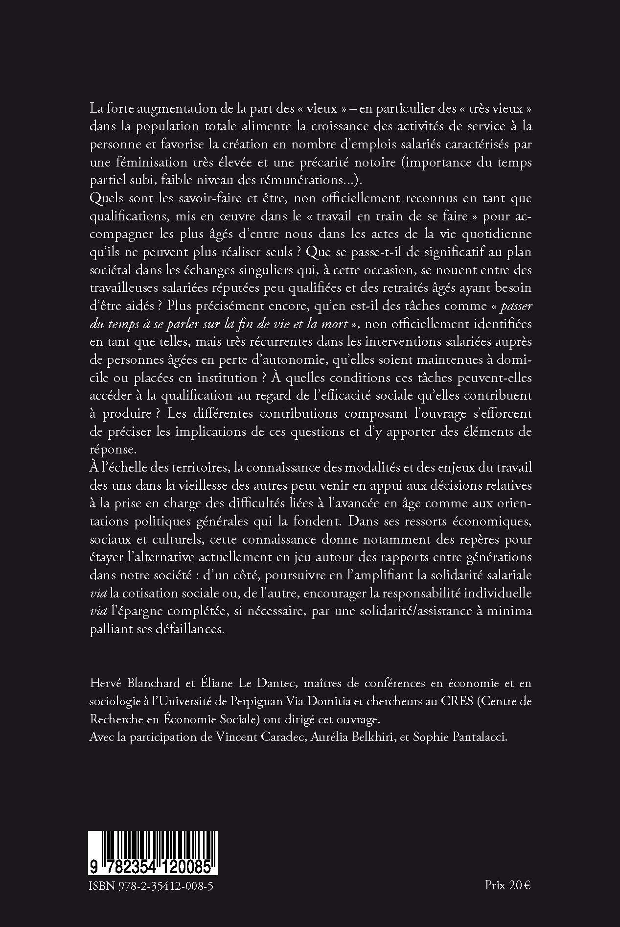 Les différentes contributions composant l’ouvrage s’efforcent de préciser les implications de ces questions et d’y apporter des éléments de réponse. À l’échelle des territoires, la connaissance des modalités et des enjeux du travail des uns dans la vieillesse des autres peut venir en appui aux décisions relatives à la prise en charge des difficultés liées à l’avancée en âge comme aux orientations politiques générales qui la fondent. Dans ses ressorts économiques, sociaux et culturels, cette connaissance donne notamment des repères pour étayer l’alternative actuellement en jeu autour des rapports entre générations dans notre société : d’un côté, poursuivre en l’amplifiant la solidarité salariale via la cotisation sociale ou, de l’autre, encourager la responsabilité individuelle via l’épargne complétée, si nécessaire, par une solidarité/assistance à minima palliant ses défaillances.