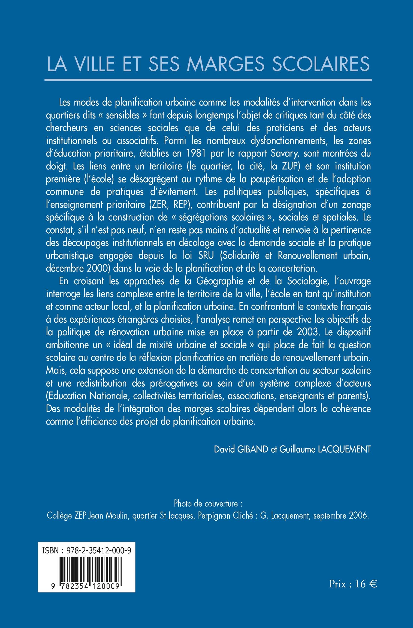 En croisant les approches de la Géographie et de la Sociologie, l’ouvrage interroge les liens complexe entre le territoire de la ville, l’école en tant qu’institution et comme acteur local, et la planification urbaine. En confrontant le contexte français à des expériences étrangères choisies, l’analyse remet en perspective les objectifs de la politique de rénovation urbaine mise en place à partir de 2003. Le dispositif ambitionne un « idéal de mixité urbaine et sociale » qui place de fait la question scolaire au centre de la réflexion planificatrice en matière de renouvellement urbain. Mais, cela suppose une extension de la démarche de concertation au secteur scolaire et une redistribution des prérogatives au sein d’un système complexe d’acteurs (Education Nationale, collectivités territoriales, associations, enseignants et parents). Des modalités de l’intégration des marges scolaires dépendent alors la cohérence comme l’efficience des projet de planification urbaine.