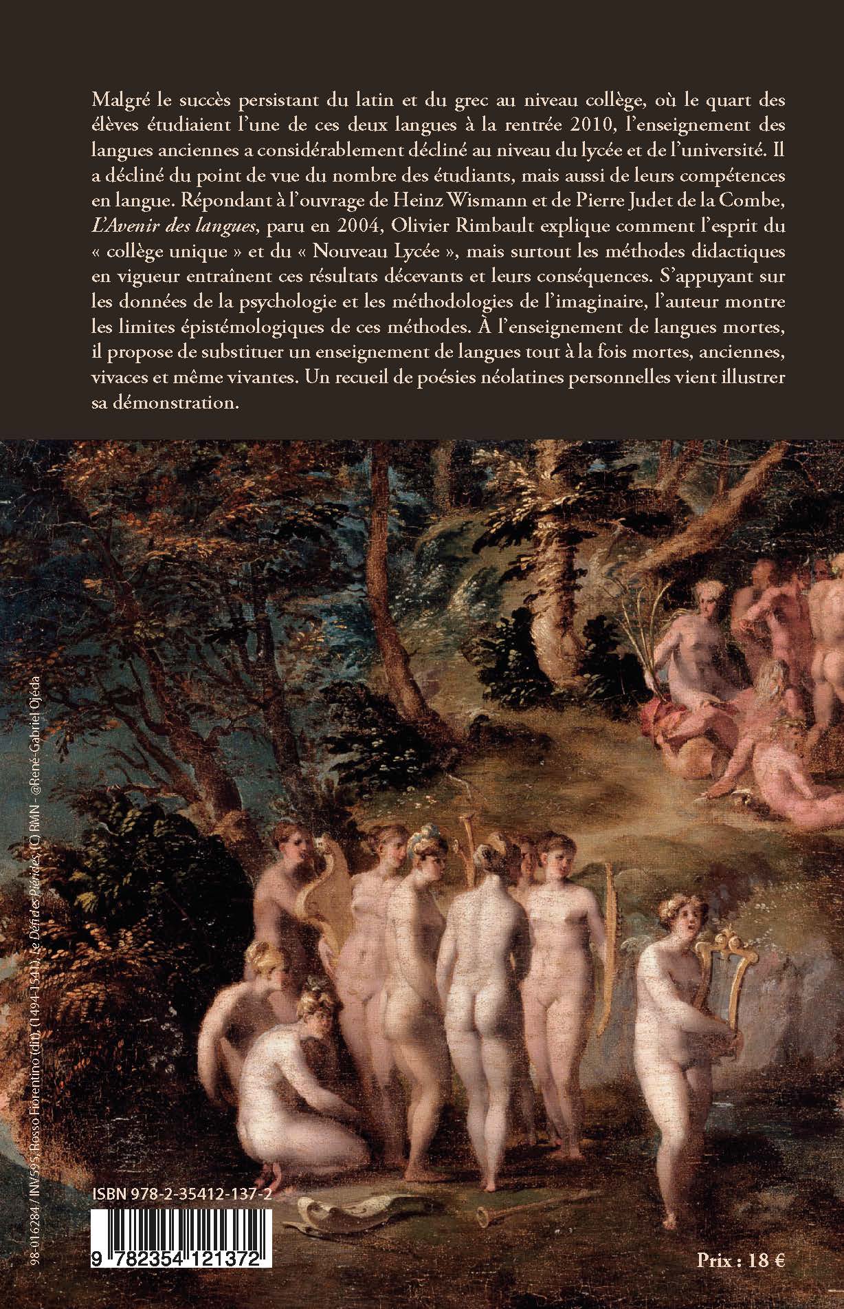 Répondant à l’ouvrage de Heinz Wismann et de Pierre Judet de la Combe, L’Avenir des langues, paru en 2004, Olivier Rimbault explique comment l’esprit du « collège unique » et du « Nouveau Lycée », mais surtout les méthodes didactiques en vigueur entraînent ces résultats décevants et leurs conséquences. S’appuyant sur les données de la psychologie et les méthodologies de l’imaginaire, l’auteur montre les limites épistémologiques de ces méthodes. À l’enseignement de langues mortes, il propose de substituer un enseignement de langues tout à la fois mortes, anciennes, vivaces et même vivantes. Un recueil de poésies néolatines personnelles vient illustrer sa démonstration.