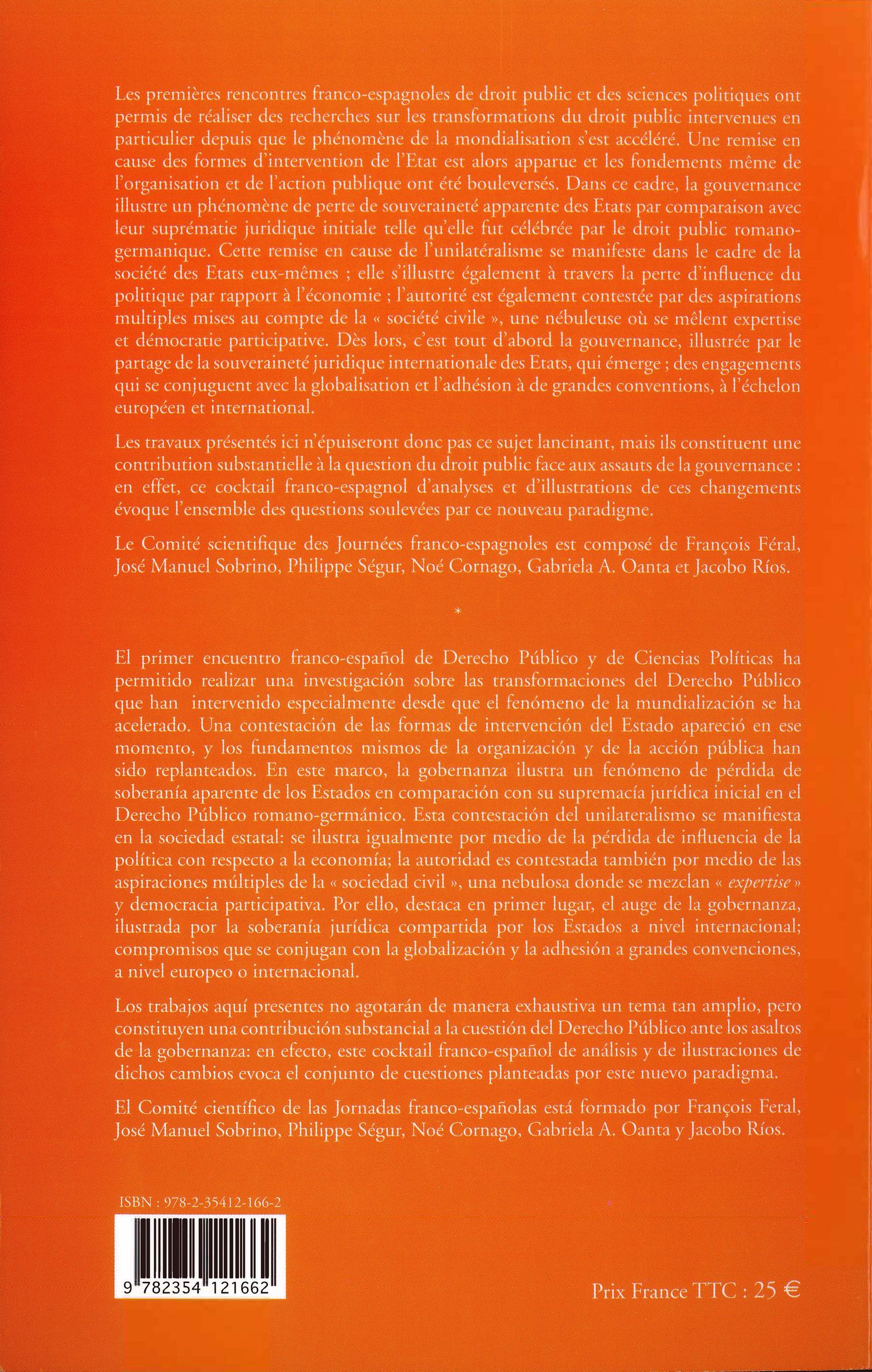Les premières journées franco-espagnoles de droit public ont permis de conduire des recherches sur les transformations du droit public à l’heure de la mondialisation. On assiste à une remise en cause des formes d’intervention de l’Etat, et les fondements même de l’organisation et de l’action publiques ont été bouleversés. Dans ce contexte, la gouvernance illustre un phénomène de perte de souveraineté apparente des Etats par comparaison avec la suprématie juridique que leur reconnaît initialement le droit public romano-germanique. De cette remise en cause témoignent également la perte d’influence du politique par rapport à l’économie et la contestation de l’autorité par des aspirations multiples mises au compte de la « société civile ».