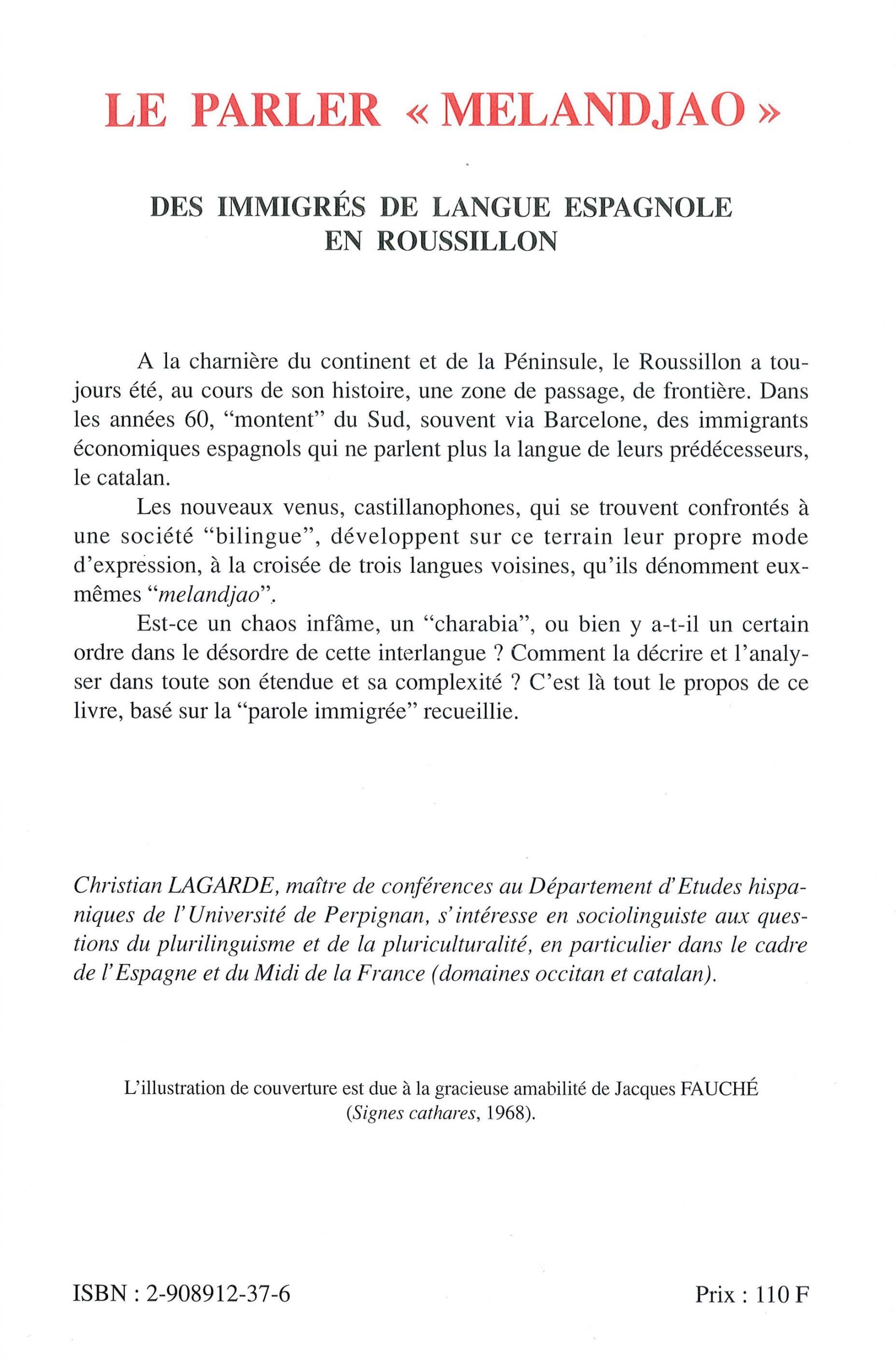 A la charnière du continent et de la péninsule ibérique, le Roussillon a toujours été une zone de passage, de frontière. Dans les années soixante du XXe siècle, arrivent du Sud en Roussillon des immigrants économiques espagnols qui ne parlent plus la langue de leurs prédécesseurs, le catalan. Ces nouveaux venus, castillanophones, développent leur propre mode d’expression, à la croisée de trois langues voisines, qu’ils dénomment eux-même » melandjao « . L’ouvrage s’attache à décrire et analyser cette interlangue dans toute son étendue et sa complexité.