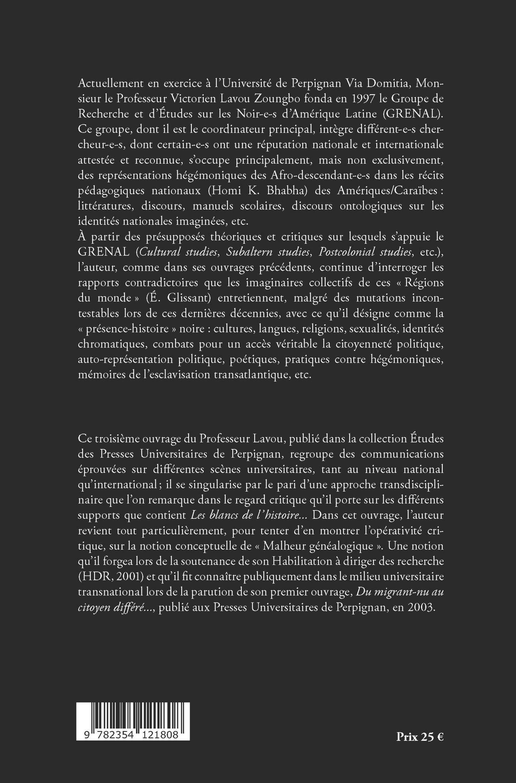 À partir des présupposés théoriques et critiques sur lesquels s’appuie le GRENAL (Cultural studies, Subaltern studies, Postcolonial studies, etc.), l’auteur, comme dans ses ouvrages précédents, continue d’interroger les rapports contradictoires que les imaginaires collectifs de ces « Régions du monde » (Edouard Glissant) entretiennent, malgré des mutations incontestables lors de ces dernières décennies, avec ce qu’il désigne comme la « présence-histoire » noire : cultures, langues, religions, sexualités, identités chromatiques, combats pour un accès véritable la citoyenneté politique, auto-représentation politique, poétiques, pratiques contre hégémoniques, mémoires de l’esclavisation transatlantique, etc.