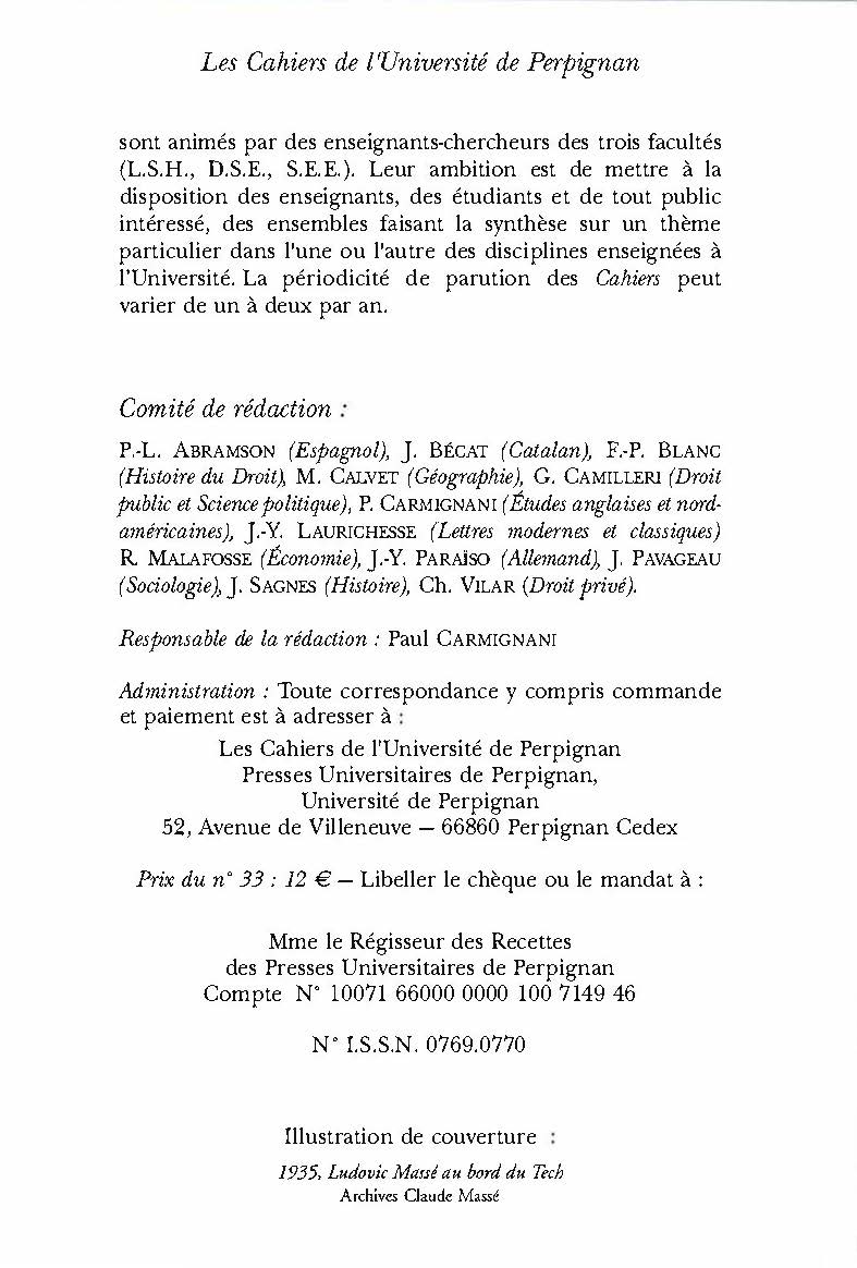 Les actes rassemblés dans ce n° 33 des Cahiers de l’université de Perpignan est consacré à Ludovic Massé. Ils essaient de faire le point sur l’homme et l’œuvre et tentent de montrer les deux faits qui déterminent l’empan du texte : l’enracinement dans le terroir catalan et l’ouverture à l’universel.Ces actes s’organisent en trois parties. La première s’efforce de préciser les rapports, explicites ou plus secrets, qui se sont créés entre la langue vernaculaire, l’imaginaire qu’elle véhicule et l’œuvre romanesque. La seconde fait l’inventaire des relations qu’au cœur de sa » toile » roussillonnaise Ludovic Massé a nouées avec ses contemporains. Enfin, la troisième partie est consacrée aux thèmes éthiques et idéologiques qui fondent et aimantent la vie de l’homme et l’œuvre : la prégnance du refus, l’appel de la liberté, l’attitude face à la violence.