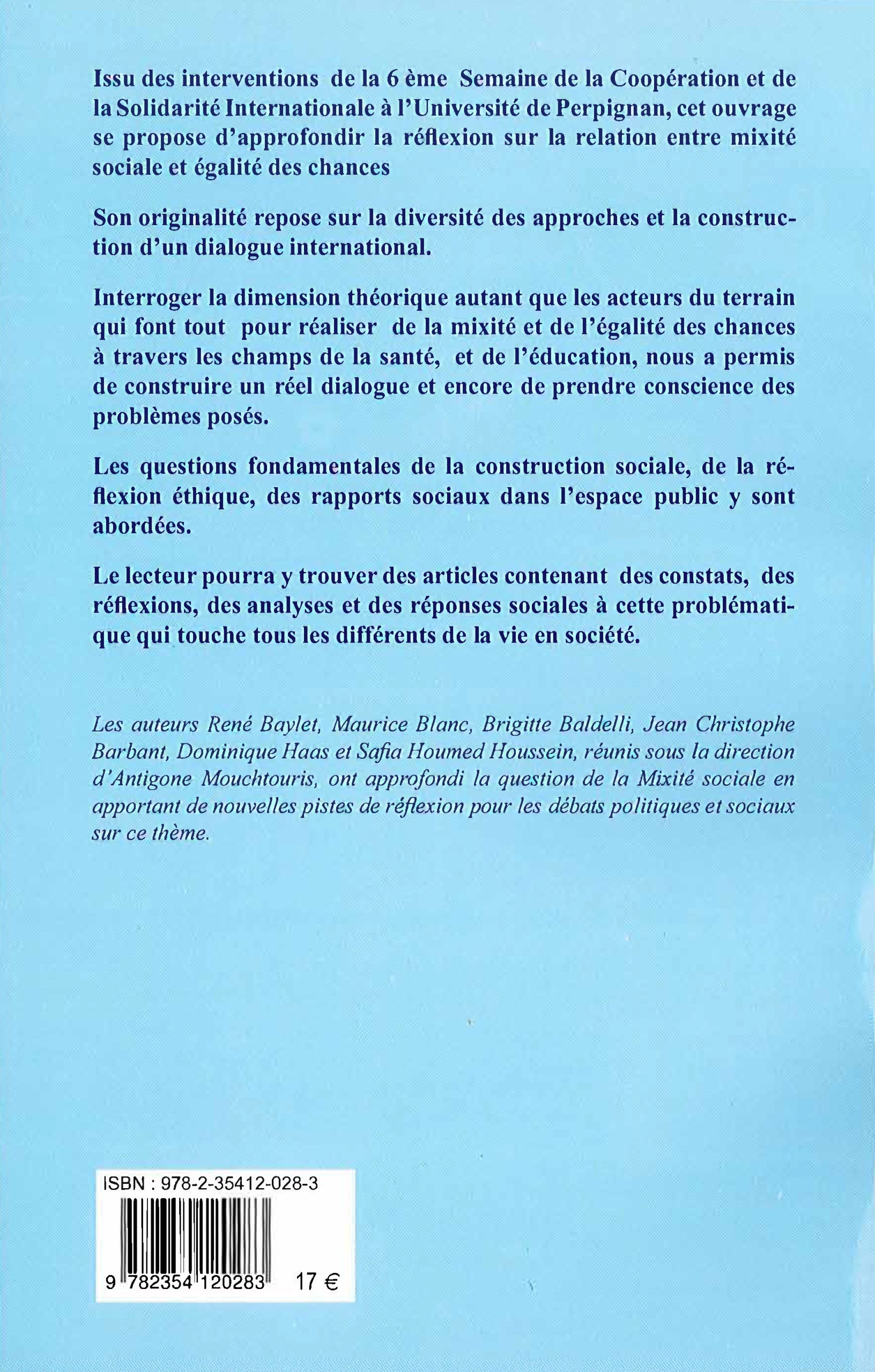 Issu des interventions de la 6e Semaine de la coopération et de la solidarité internationale à l’Université de Perpignan, cet ouvrage se propose d’approfondir la réflexion sur la relation entre mixité sociale et égalité des chances. Son originalité repose sur la diversité des approches et la construction d’un dialogue international. Interrogeant la dimension théorique autant que pratique de la mixité et de l’égalité des chances aux travers des champs de la santé et de l’éducation. Les questions fondamentales de la construction sociale, de la réflexion éthique, des rapports sociaux dans l’espace public y sont abordées. Le lecteur pourra trouver là des articles contenant des constats, des réflexions et des analyses de réponses sociales à cette problématique qui touche tous ces différents aspects de la vie en société.
