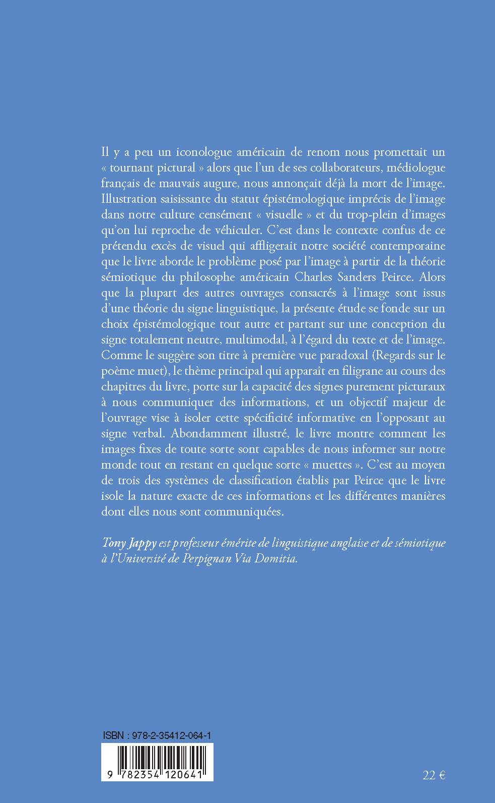 C’est dans le contexte confus de ce prétendu excès de visuel qui affligerait notre société contemporaine que le livre aborde le problème posé par l’image à partir de la théorie sémiotique du philosophe américain Charles Sanders Peirce. Alors que la plupart des autres ouvrages consacrés à l’image sont issus d’une théorie du signe linguistique, la présente étude se fonde sur un choix épistémologique tout autre et partant sur une conception du signe totalement neutre, multimodal, à l’égard du texte et de l’image. Comme le suggère son titre à première vue paradoxal (Regards sur le poème muet), le thème principal qui apparaît en filigrane au cours des chapitres du livre, porte sur la capacité des signes purement picturaux à nous communiquer des informations, et un objectif majeur de l’ouvrage vise à isoler cette spécificité informative en l’opposant au signe verbal.