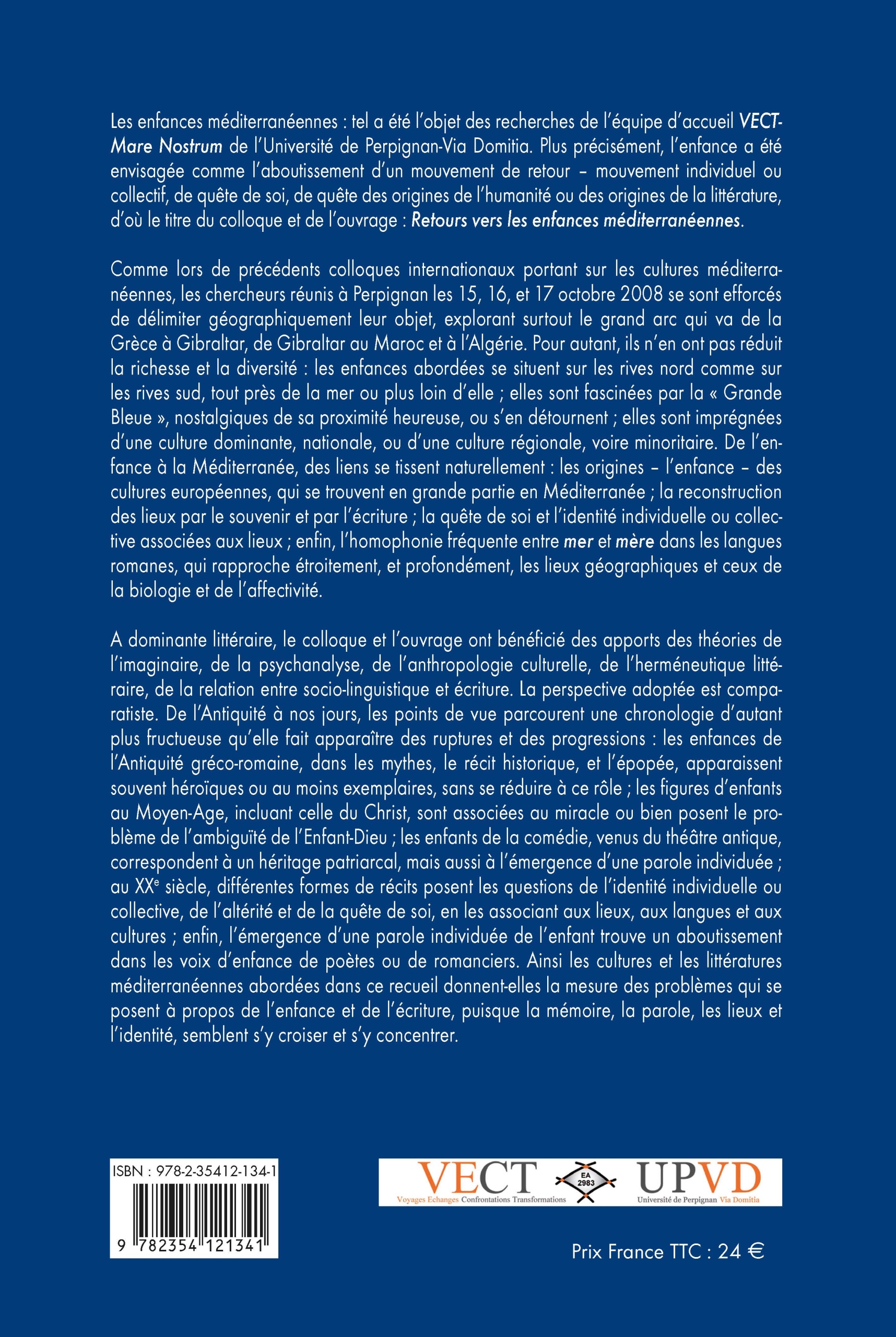 Les enfances méditerranéennes : tel a été l’objet des recherches de l’équipe d’accueil VECT-Mare Nostrum de l’Université de Perpignan-Via Domitia. Plus précisément, l’enfance a été envisagée comme l’aboutissement d’un mouvement de retour – mouvement individuel ou collectif, de quête de soi, de quête des origines de l’humanité ou des origines de la littérature, d’où le titre du colloque et de l’ouvrage : Retours vers les enfances méditerranéennes.