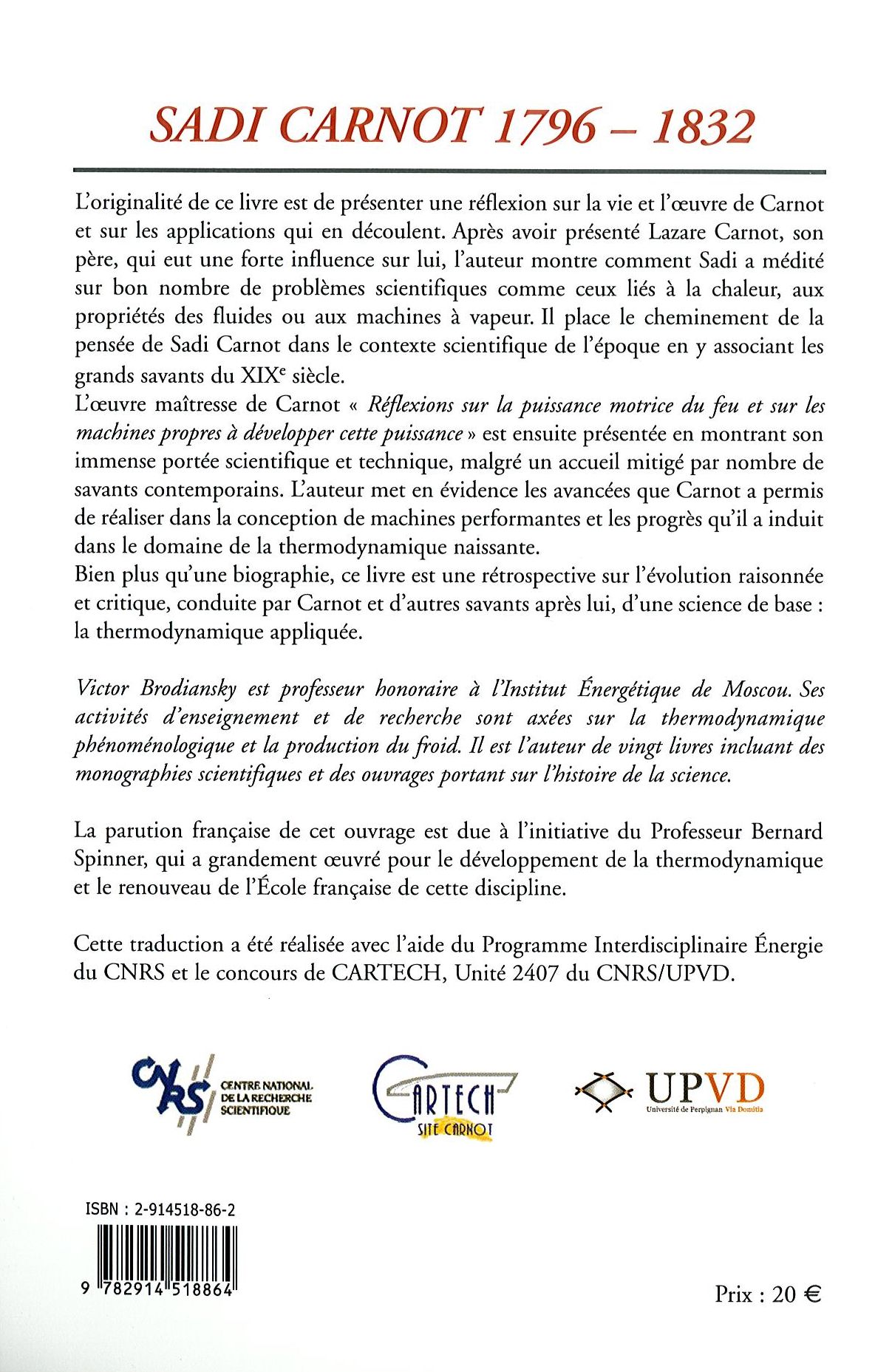L’originalité de ce livre est de présenter une réflexion sur la vie et l’œuvre de Carnot et sur les applications qui en découlent. Après avoir présenté Lazare Carnot, son père, qui eut une forte influence sur lui, l’auteur montre comment Sadi a médité sur bon nombre de problèmes scientifiques comme ceux liés à la chaleur, aux propriétés des fluides ou aux machines à vapeur. Il place le cheminement de la pensée de Sadi Carnot dans le contexte scientifique de l’époque en y associant les grands savants du XIXe siècle.L’œuvre maîtresse de Carnot  » Réflexions sur la puissance motrice du feu et sur les machines propres à développer cette puissance  » est ensuite présentée en montrant son immense portée scientifique et technique. L’auteur met en évidence les avancées que Carnot a permis de réaliser dans la conception de machines performantes et les progrès qu’il a induit dans le domaine de la thermodynamique naissante.