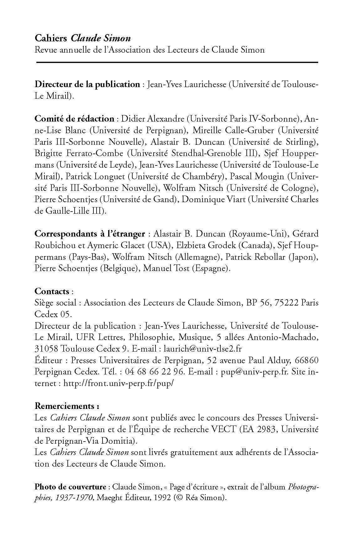 Cette 4ème livraison présente en particulier un texte de Claude Simon, «Matériaux de construction», paru en 1960 dans Les Lettres Nouvelles (directeur Maurice Nadaud) et jamais repris dans son intégralité, ainsi qu’un dossier critique sur L’Herbe, complété par deux textes témoignant de la réception de ce roman en France et aux USA lors de sa publication (1958).